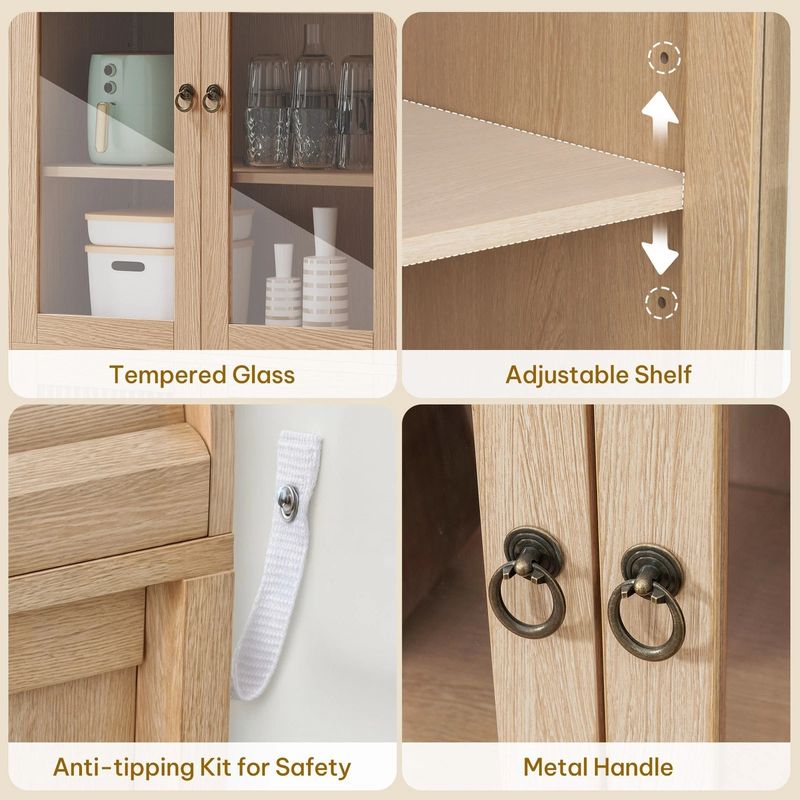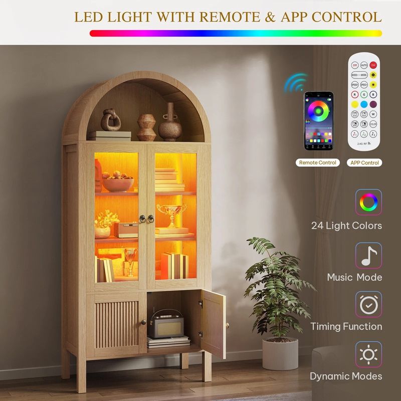 This stylish arched kitchen cabinet blends elegance and durability, supporting up to 225 lbs. Featuring tempered glass doors with adjustable shelves, customizable LED lighting, and mid-century modern details, it’s versatile enough to serve as a pantry, bookcase, or living room storage. Easy to assemble and built to last.